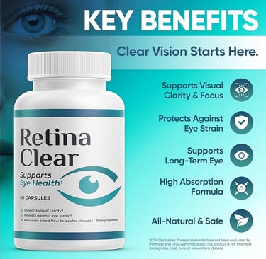 Retina Clear is an advanced eye health supplement designed to support clear vision and daily eye comfort. Its natural, science-backed formula helps nourish the retina, improve visual focus, and reduce strain caused by prolonged screen time and environmental exposure. Regular use of Retina Clear may help protect eye cells, support healthy vision, and promote long-term eye wellness. Ideal for modern lifestyles, it provides gentle yet effective nutritional support for people who want to maintain sharp, comfortable eyesight and protect their vision as they age.